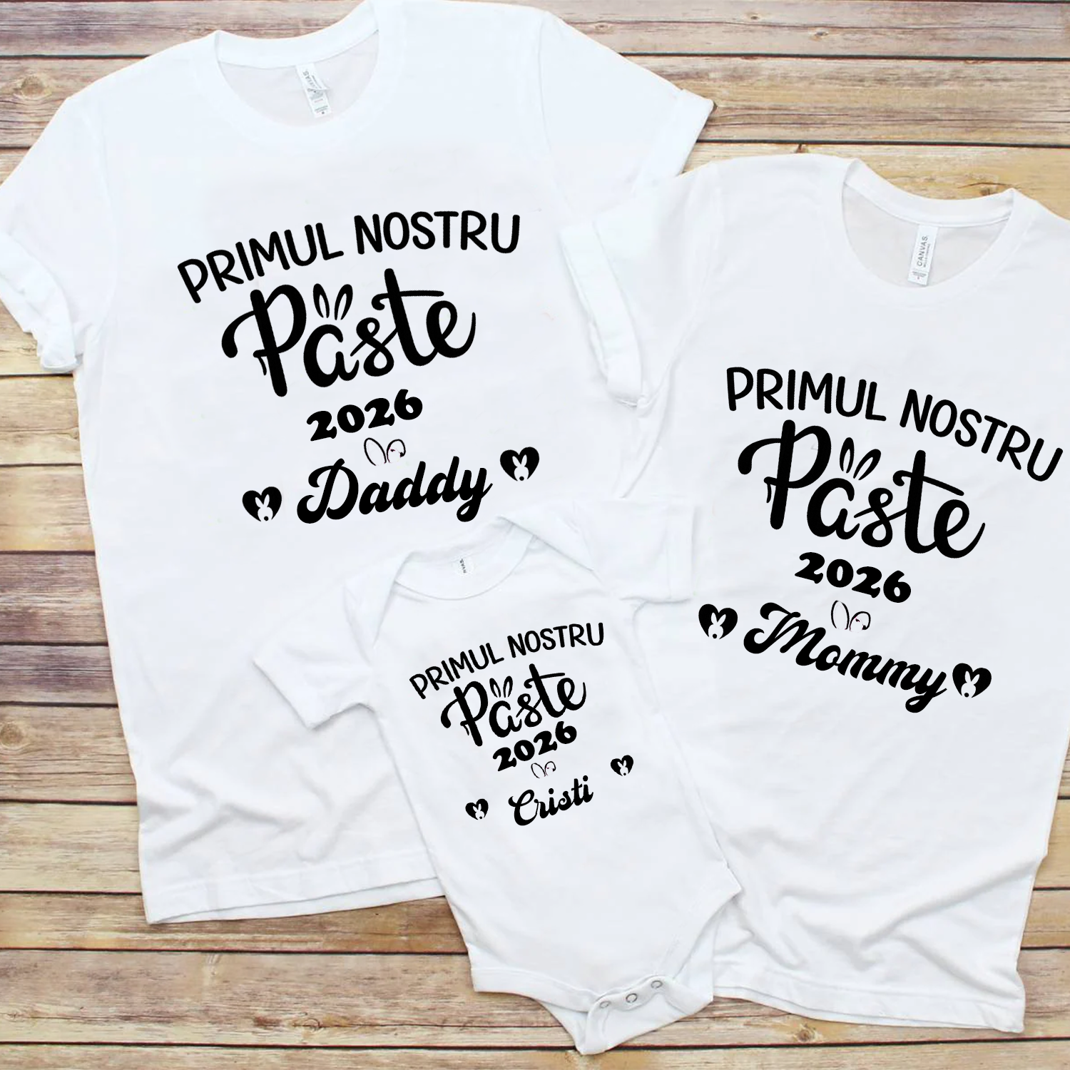 Faceți primul Paște împreună de neuitat cu setul „Primul nostru Paște – Daddy, Mommy & Bebe”! 🎉 Acest set adorabil include tricouri pentru părinți și body pentru bebeluș, toate decorate cu un design jucăuș de Paște.